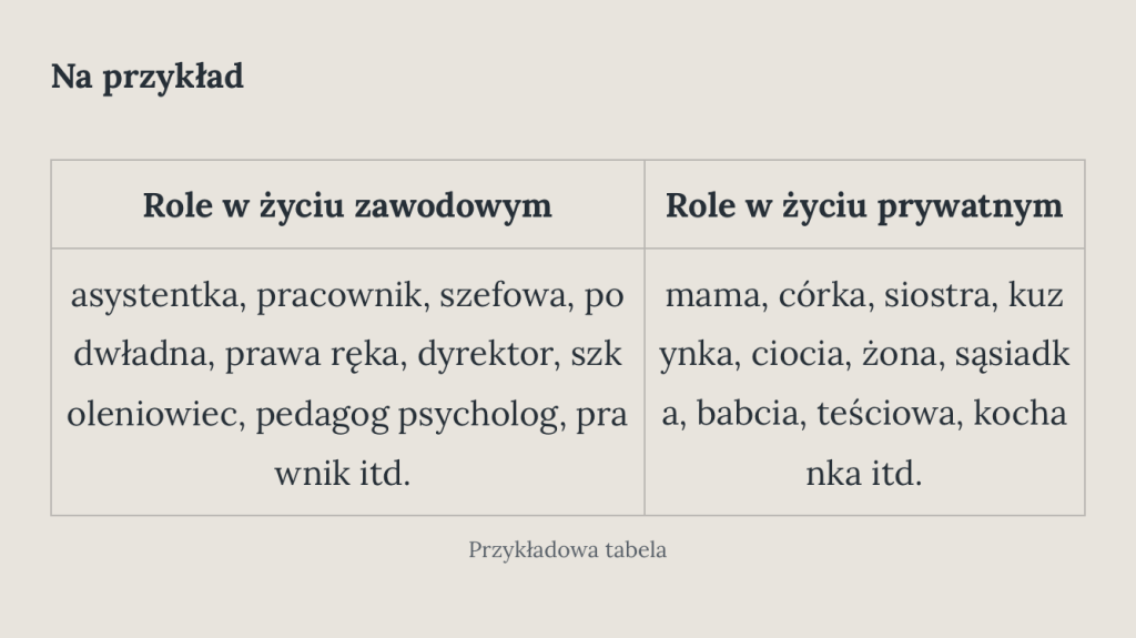 - Wypisz role, które pełnisz w życiu zawodowym, i te, które pełnisz w życiu prywatnym.