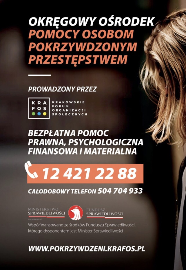 Wczoraj zostało zawarte porozumienie o współpracy z Krakowskim Forum Organizacji Społecznych KraFOS – federacji organizacji pozarządowych, która od 11 lat działa na rzecz osób pokrzywdzonych przestępstwem oraz prowadzi Okręgowy Ośrodek Pomocy Osobom Pokrzywdzonym Przestępstwem oraz 6 Lokalnych Punktów Pomocy Osobom Pokrzywdzonym Przestępstwem.